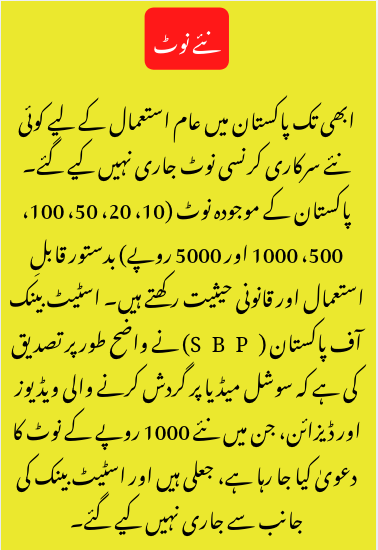 The existing currency notes of Pakistan (Rs. 10, 20, 50, 100, 500, 1,000, and 5,000) remain valid and legal tender. The State Bank of Pakistan (SBP) confirmed that viral clips and designs on social media claiming a “new 1,000‑rupee note” are fake and not issued by SBP.