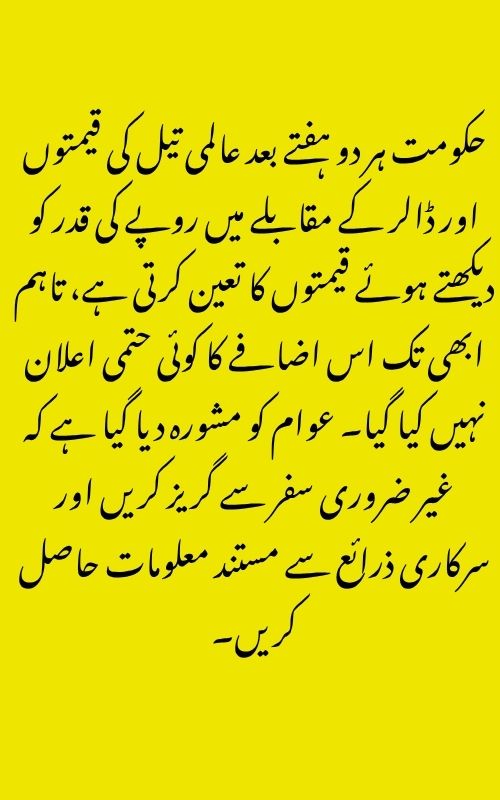 Petroleum prices in Pakistan are revised every two weeks, based on fluctuations in international oil markets and exchange rates. The government typically announces changes after reviewing recommendations from relevant authorities.