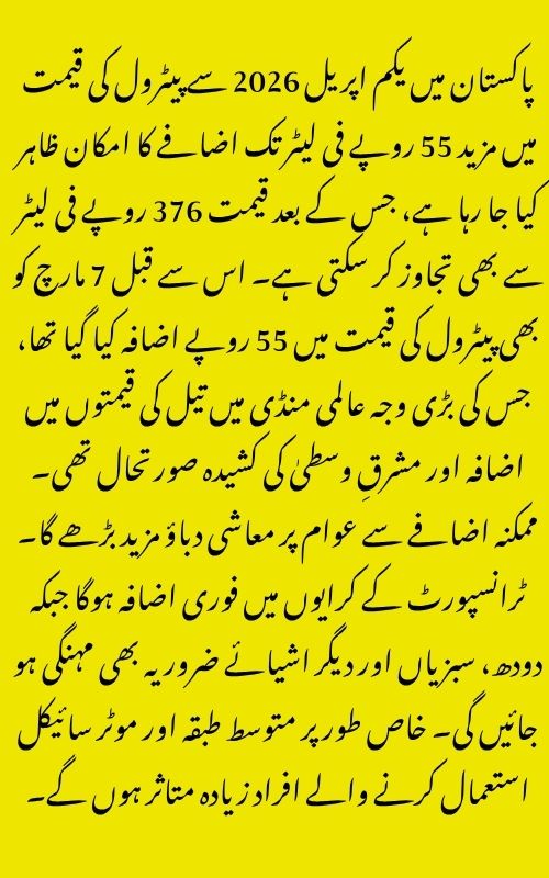 Pakistan is bracing for another significant increase in petroleum prices, with reports suggesting that petrol could rise by up to Rs55 per litre starting from April 1, 2026. If implemented, this would mark the second major hike within a month, putting additional financial pressure on already strained households.